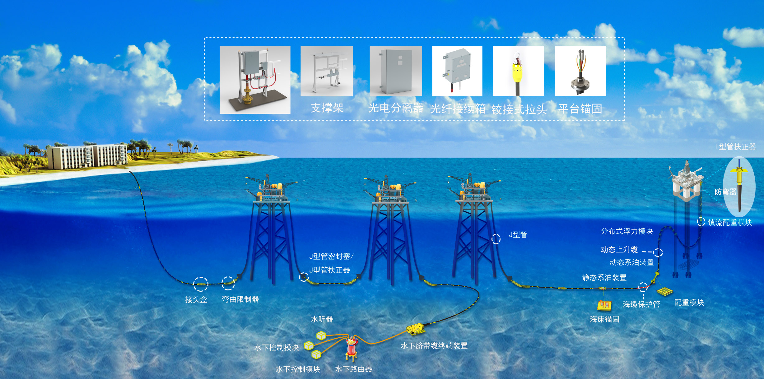 海上油氣平臺海纜系統通過海纜以及油氣海纜附件實現固定式平臺與岸基,固定式平臺與浮式平臺,固定式平臺與水下模塊之間,浮式平臺與水下模塊之間的互聯互通。有平臺與岸基光電互聯系統、平臺間光電互聯系統、平臺與水下模塊間光電互聯系統。三種互聯系統實現水下的油氣資源的開發和利用,滿足平臺作業的?電力和通信需求。